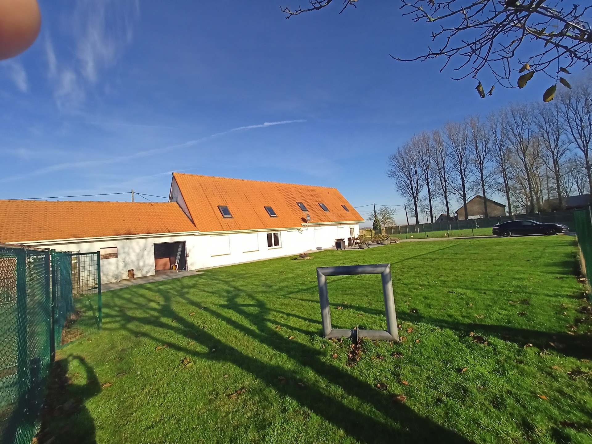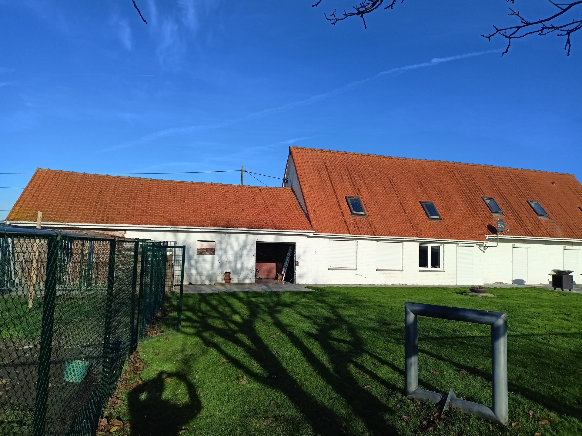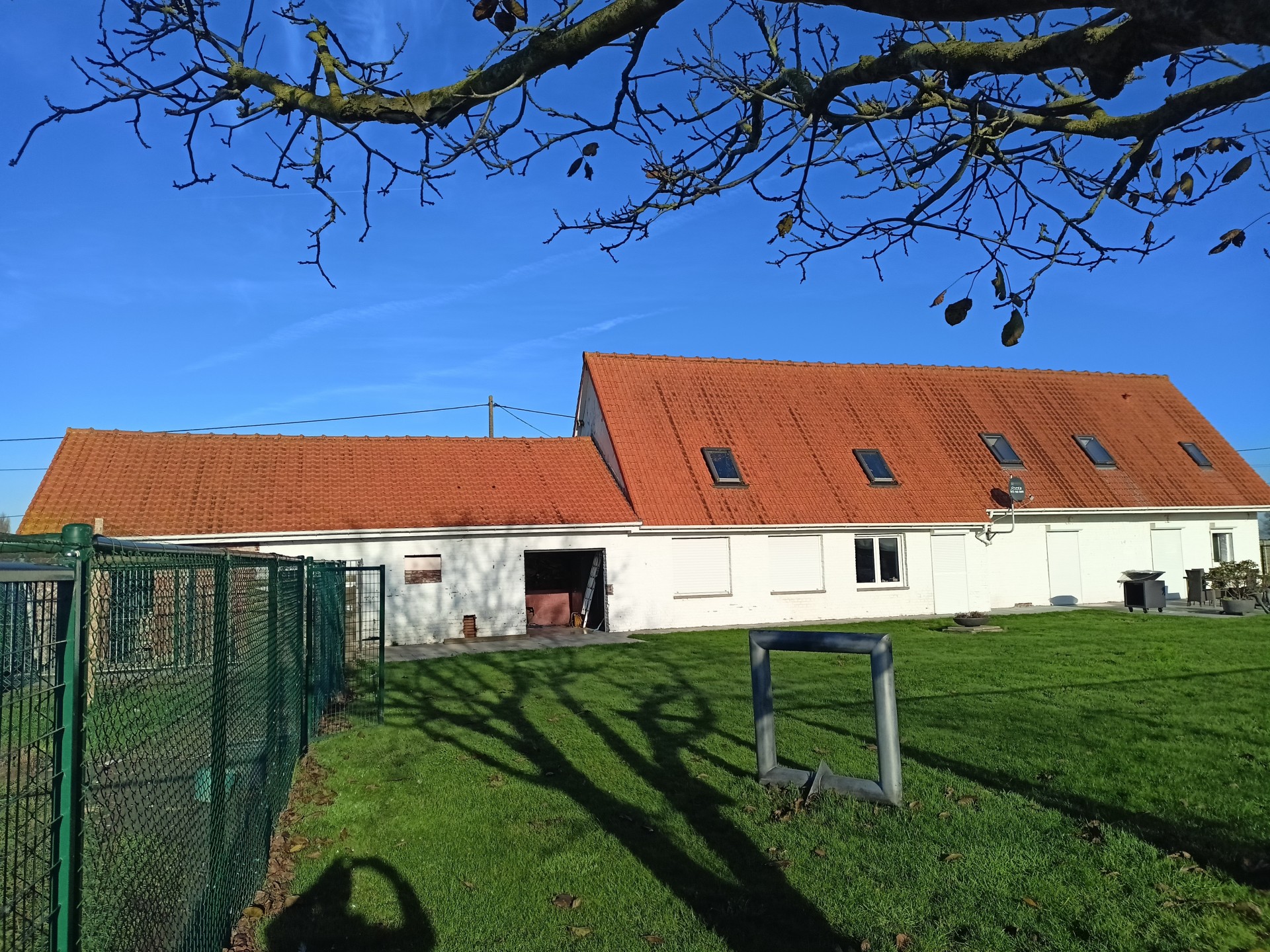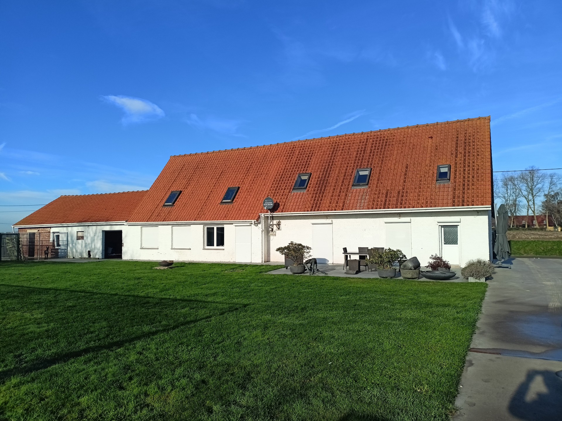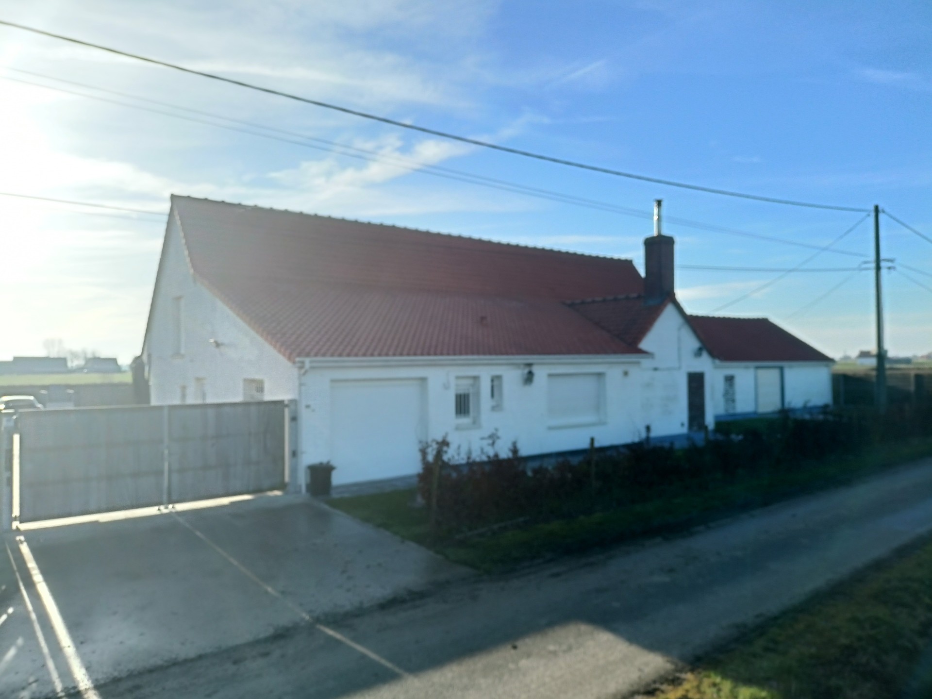 Landhuis met grote tuin langs een rustig landweggetje juist over de grens in Hondschoote. De woning is helemaal gerenoveerd. Langs de moderne inkom met vestiare komt men in de gang die toegang tot de nieuwe keuken. Er is een mooi salon en een woonkamer die uitkijkt op de tuin. Op de benedenverdieping bevinden zich drie ruime slaapkamers en een bureau, de wasplaats en de eerste badkamer met massagedouche. Op de bovenverdieping komt men via de overloop in de twee ruime slaapkamers en de tweede moderne badkamer met ligbad. Aan de woning grenzen een ruime garage met plaats voor 2 auto's Het dak van de woning werd vernieuwd. .De volledig omheinde tuin met weide en perken is toegankelijk via een elektrische poort en ligt aan de zuidkant van de woning.