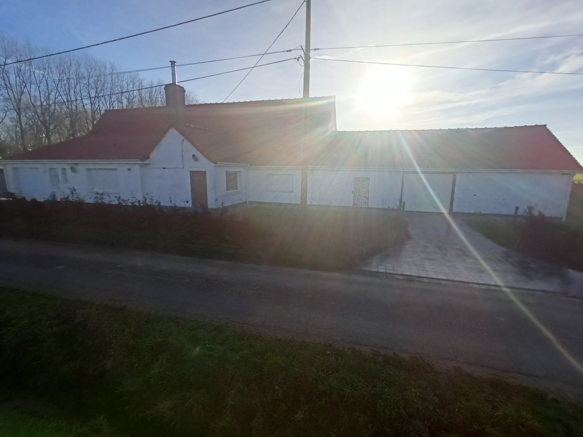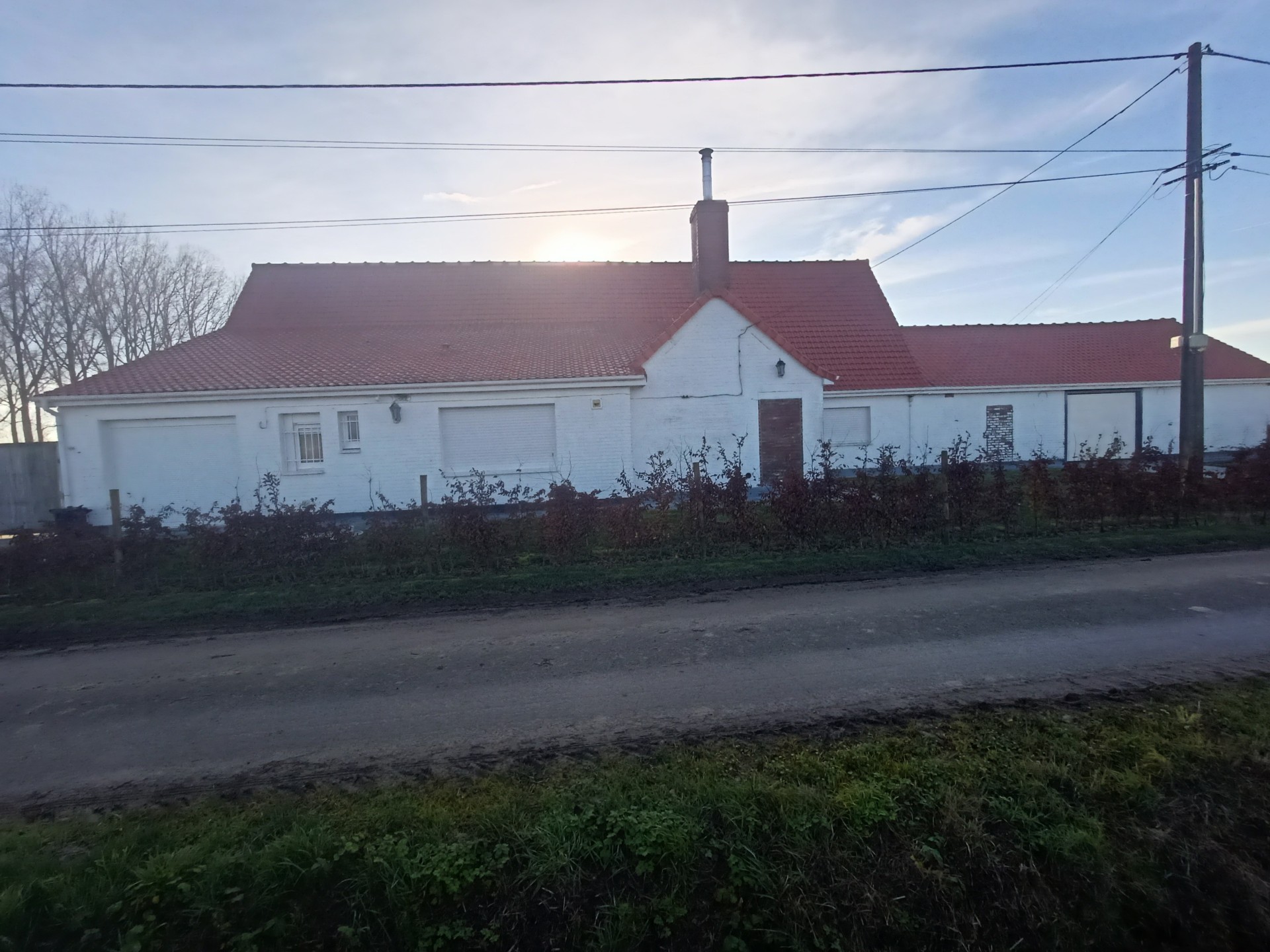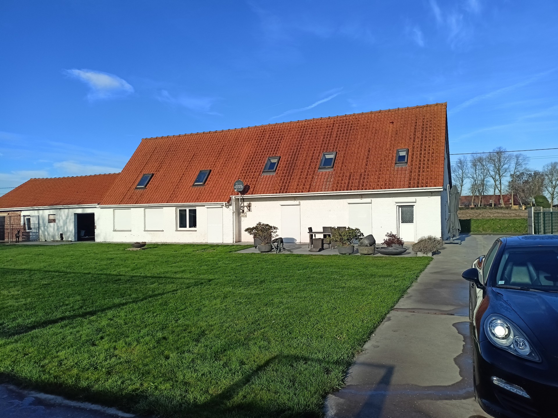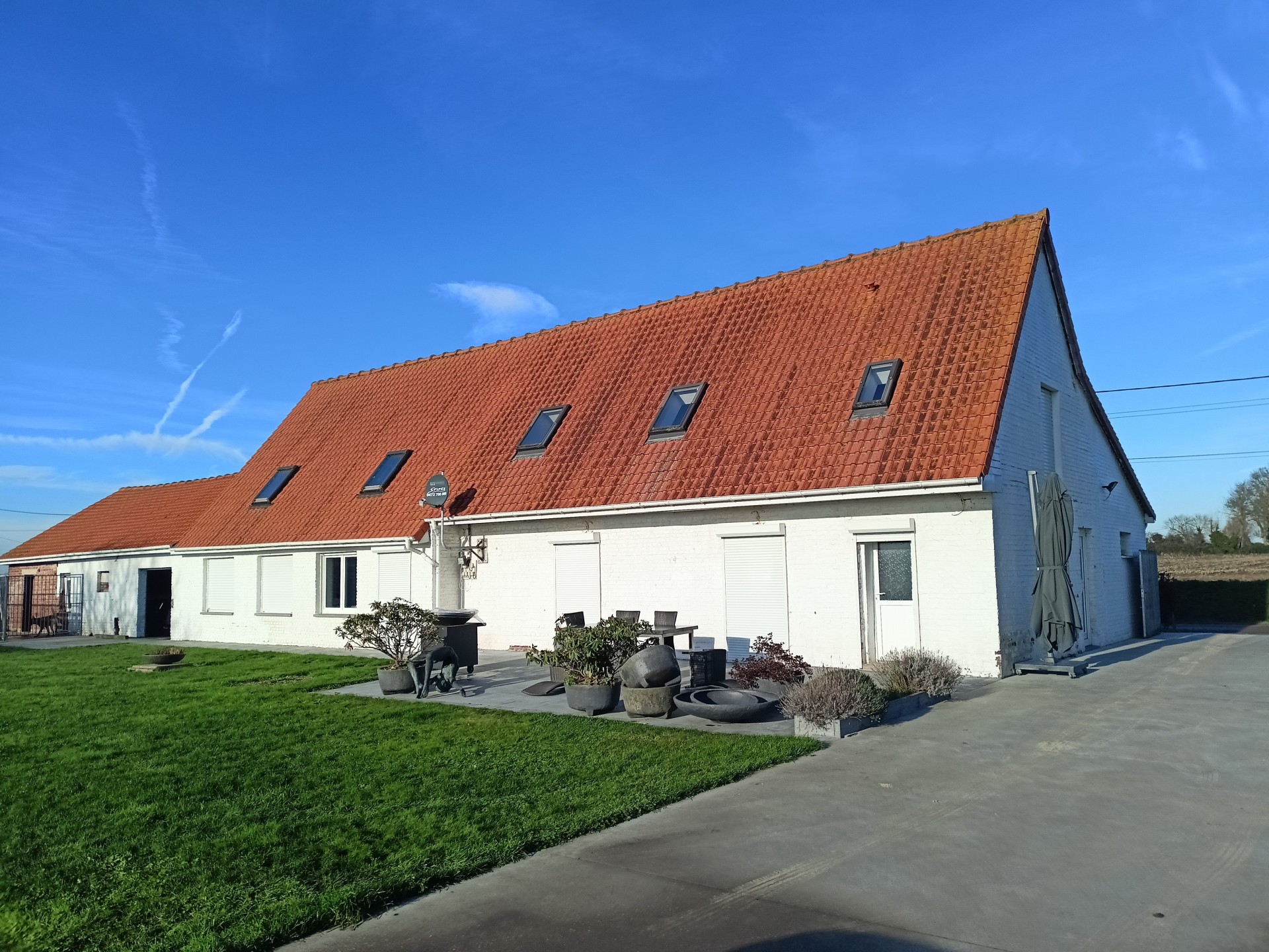 Landhuis met grote tuin langs een rustig landweggetje juist over de grens in Hondschoote. De woning is helemaal gerenoveerd. Langs de moderne inkom met vestiare komt men in de gang die toegang tot de nieuwe keuken. Er is een mooi salon en een woonkamer die uitkijkt op de tuin. Op de benedenverdieping bevinden zich drie ruime slaapkamers en een bureau, de wasplaats en de eerste badkamer met massagedouche. Op de bovenverdieping komt men via de overloop in de twee ruime slaapkamers en de tweede moderne badkamer met ligbad. Aan de woning grenzen een ruime garage met plaats voor 2 auto's Het dak van de woning werd vernieuwd. .De volledig omheinde tuin met weide en perken is toegankelijk via een elektrische poort en ligt aan de zuidkant van de woning.
